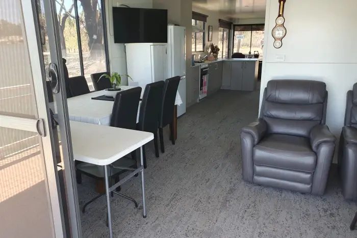 7. Internally. Very well appointed kitchen with ample work benches, plenty of cupboard space. Features include microwave, full size refrigerator with freezer. Gas stove with oven etc.